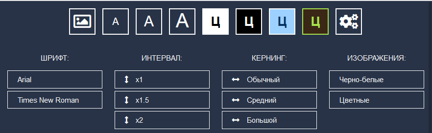 - Имеется возможность включать и отключать изображения на сайте, изменять размер шрифта, регулировать межстрочный интервал и кернинг.