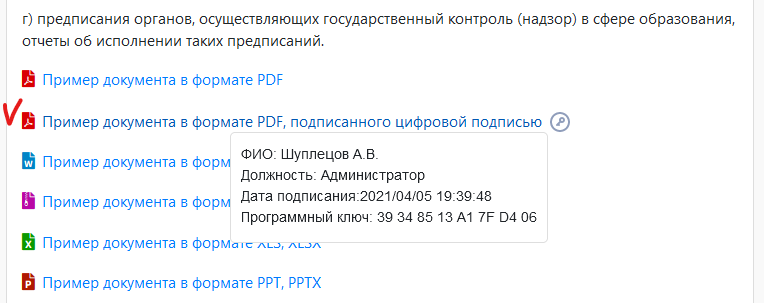 5. После сохранения ссылки с заданными параметрами, при просмотре материала возле ссылки на документ, появится иконка цифровой подписи. При наведении на иконку или на ссылку, во всплывающем окне отобразится дополнительная информация о ЦП