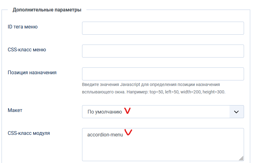 На вкладке Дополнительные параметры необходимо выбрать Макет По-умолчанию. В поле CSS-класс модуля указать класс accordion-menu.