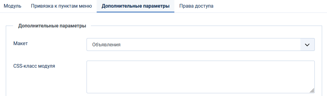 Чтобы применить данное оформление для модуля необходимо на вкладке Дополнительные параметры выбрать макет Объявления.